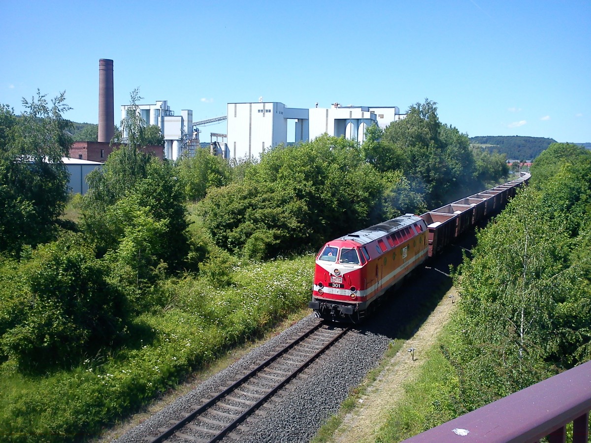 MEG 301 mit einem Anhydritzug beim Verlassen des Bf Niedersachswerfen in Richtung Nordhausen (zum Bild)